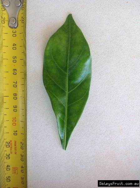 برگ ها به رنگ سبز براق، واژتخم مرغی تا بیضوی شکل، به طول 10 تا 18 سانتیمتر و پهنای 3 تا 5 سانتیمتر وجود دارند. رگبرگ ها به رنگ مایل به زرد و رگبرگ میانی برجسته می باشد. برگ های تازه تشکیل شده به رنگ سبز بسیار روشن دیده می شوند.