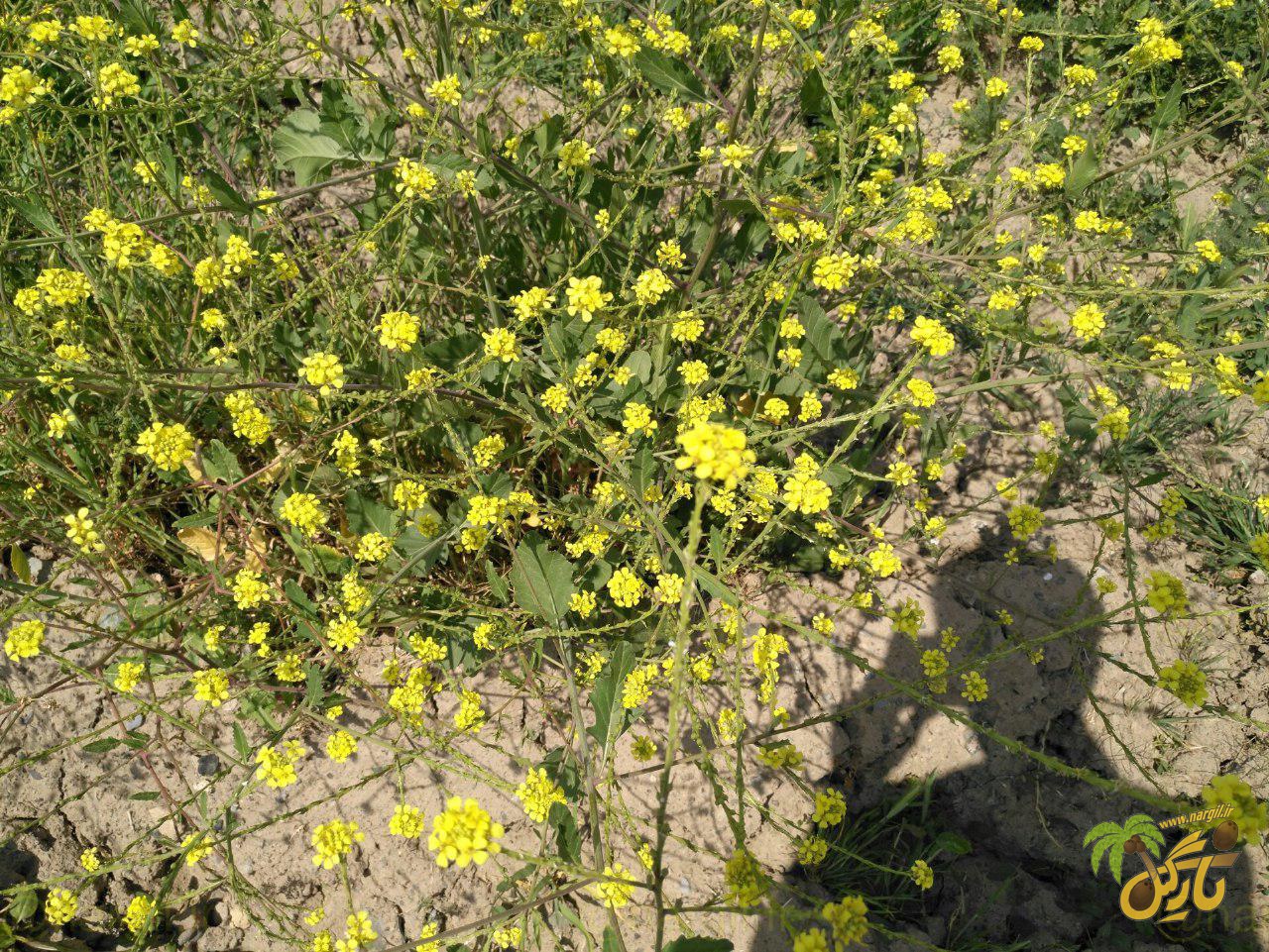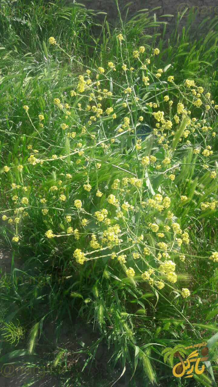 گل ها به رنگ زرد لیموئی با رگه های تیره، کاسبرگ ها به طول 3 تا 5 و گلبرگ ها به طول 5 تا 8 میلیمتر هستند. میوه این گیاه خورجینک، به طول 6 تا 7 میلیمتر که به طور مشخص دوشاخه است. حجره پایینی هر میوه، باریک، استوانه ای شکل و معمولا محتوی یک بذر است. چنانچه این بخش از میوه بدون بذر باشد، دمگل مانند خواهد بود.