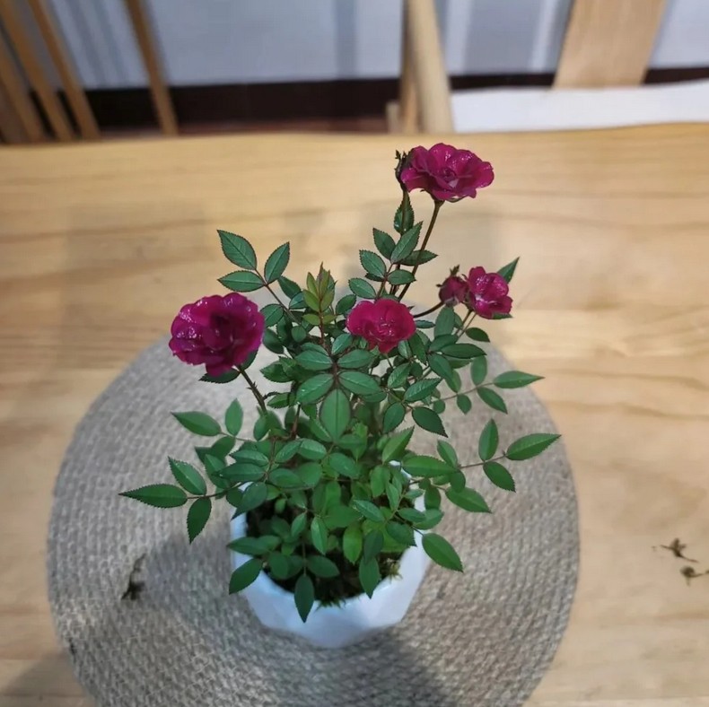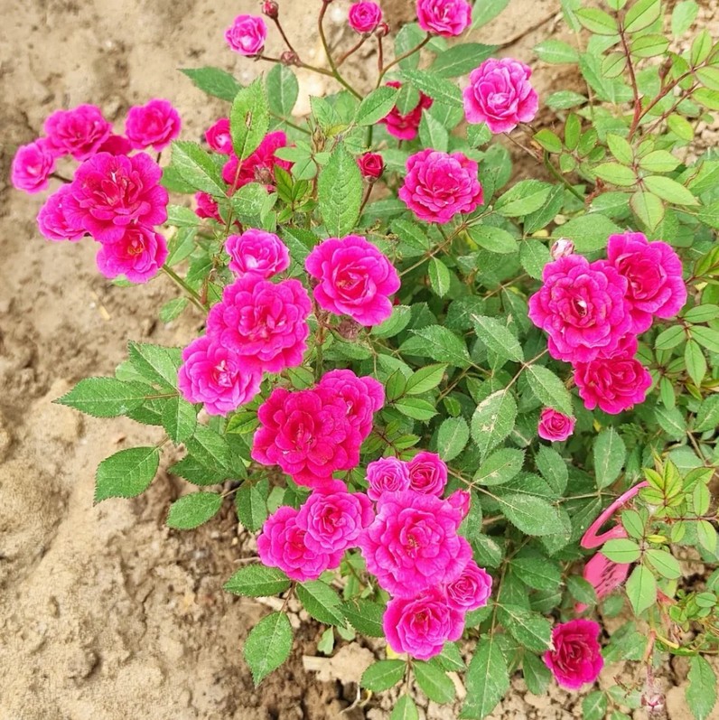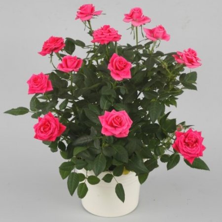 گلها کوچک تا متوسطِ مینیاتوری، منفرد یا در خوشههای کمگل ظاهر میشوند و فرم آنها از غنچه کشیده تا جامی/رزت در زمان شکوفایی تغییر میکند. رنگ گل در این رقم غالباً در طیف صورتی پررنگ تا سرخابی دیده میشود و با پیرشدن گل ممکن است اندکی روشنتر گردد. تعداد گلبرگها معمولاً زیاد است و همین موضوع به گل حالت پُرپر میدهد. پرچمها زردرنگاند و کاسبرگها باریک و نوکدار بوده و در مرحله غنچه برجستهترند.