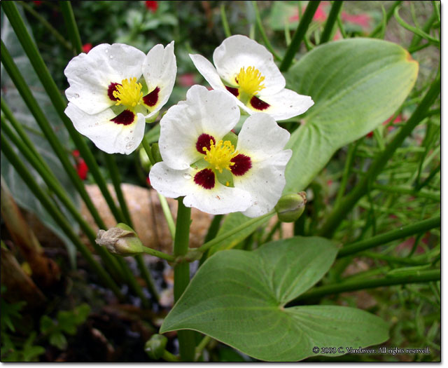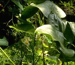 زاگیتاریا دارای برگ های بدون کرک است. استوانه ای شکل در برش عرضی آن با دمبرگ اسفنجی که ممکن است طول بیش از 0.75 متر (2.5 فوت) داشته باشد. گل آذین آن معمولا کوتاه تر از برگ ها و در بستر خوابیده است. گل ها در حلقه ها و یا جفت در گره هستند. آنها دارای سه گلبرگ، که هر کدام با یک پایه زرد ، و سه کاسبرگ سبز و سفید است ک ه ضخامت آن تا 5 سانتی متر میشود. گلدهی آن از ماه ژوئن تا سپتامبر است.