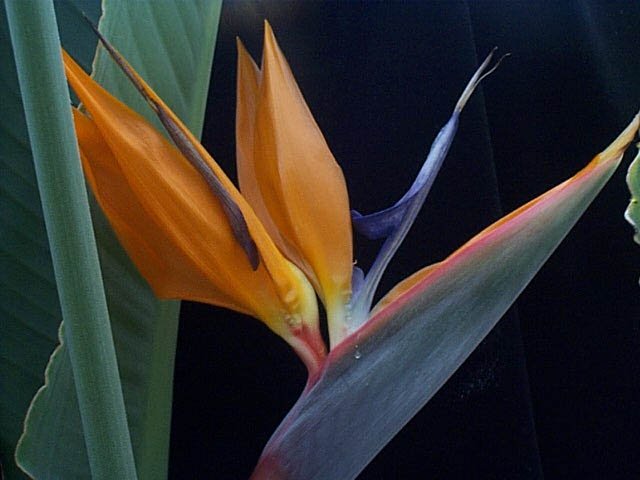 گل آذین شامل اسپات سبز بار گه های ارغوانی و قایق مانند است که از آن گلهای نارنجی و آبی رنگ خارج میشوند.