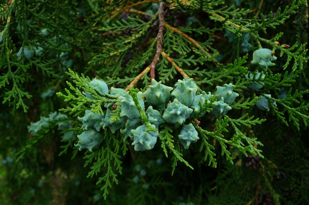 .ميوه‌ی آن گرد يا تخم‌مرغى شكل و كبود رنگ‌است و وقتی رسیده شوند به رنگ قهوهای در می آیند .و ترشحات كبود يا نقره‌اى سطح ميوه را فرا گرفته است. ميوه‌ی آن از  ١٠ - ٨  فلس‌ تشكيل مى‌شود.