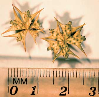 میوه آن در موقع رسیدن قسمت های پنجگانه آن از هم جدا و پراکنده می شوند.هر یک از این قسمت های پنج گانه در سطح بیرونی خاردار است.
