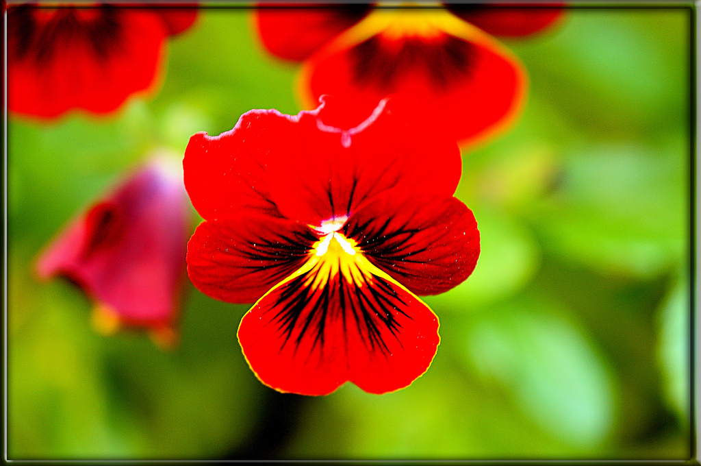 در بنفشه فرنگی، گل ها درشت و از 3-4 گلبرگ نامنظم به رنگ های آبی، سفید، زرد و گاهی بنفش مایل به سیاه تشکیل شده که با لکه هایی از رنگ ها ی دیگر منقوش شده است و گاهی یکی از این رنگ ها به صورت غالب در آمده و تمام گل به آن رنگ دیده می شود. به علت رنگ های بسیار متنوع، منظره زیبایی داشته و از آن به عنوان زمینه در گلکاری استفاده می شود. موارد استفاده از بنفشه شامل تزیین زمین های مرطوب، محل های سایه گیر، تولید عطر در انواع معطر و تهیه دسته گل در انواع داری دمگل طویل می باشد.