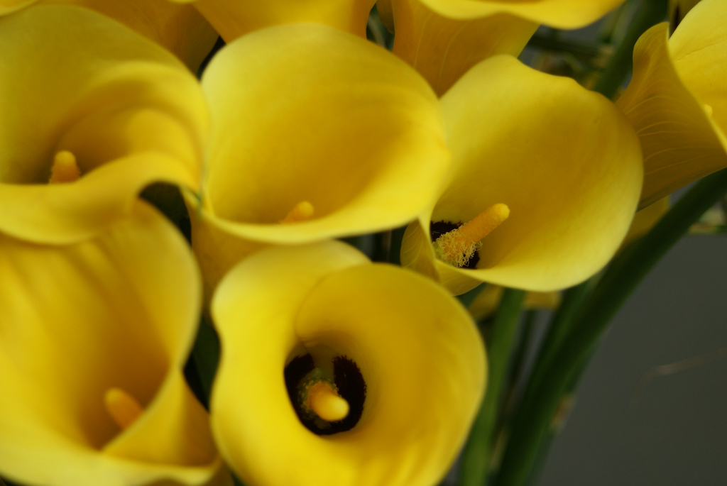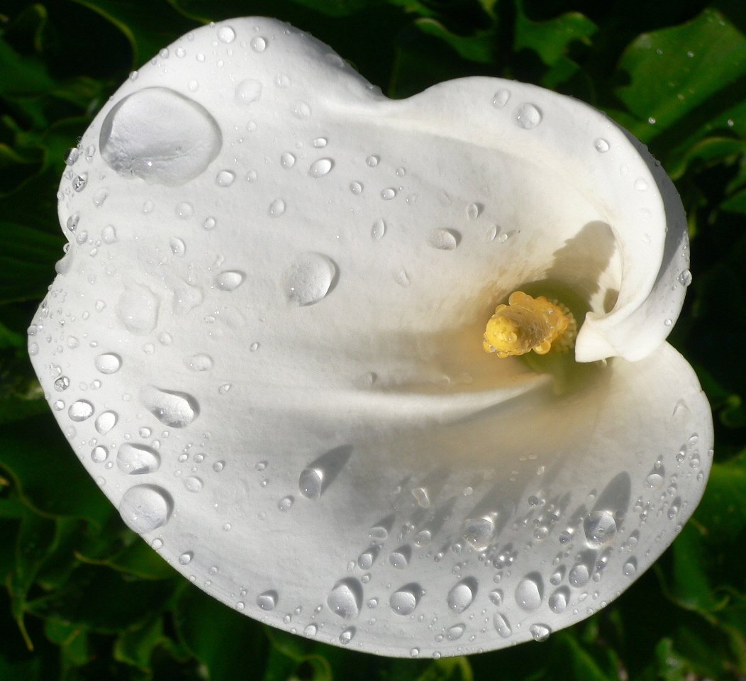 گلآذین از نوع اسپادیکس (میلهٔ مرکزی) است که با یک براکتهٔ قیفیشکل به نام اسپات (spathe) احاطه میشود؛ همان بخشی که به اشتباه “گل” تصور میشود. اسپات در این گونه به رنگ زرد طلایی درخشان است و اغلب فرم شیپوری/قیفی با دهانهٔ باز و لبههای کمی موجدار دارد. اسپادیکس در مرکز قرار گرفته و معمولاً زرد تا زرد نارنجی است. تضاد رنگ زرد اسپات با سبزی برگها شاخصترین ویژگی ظاهری این گیاه است.