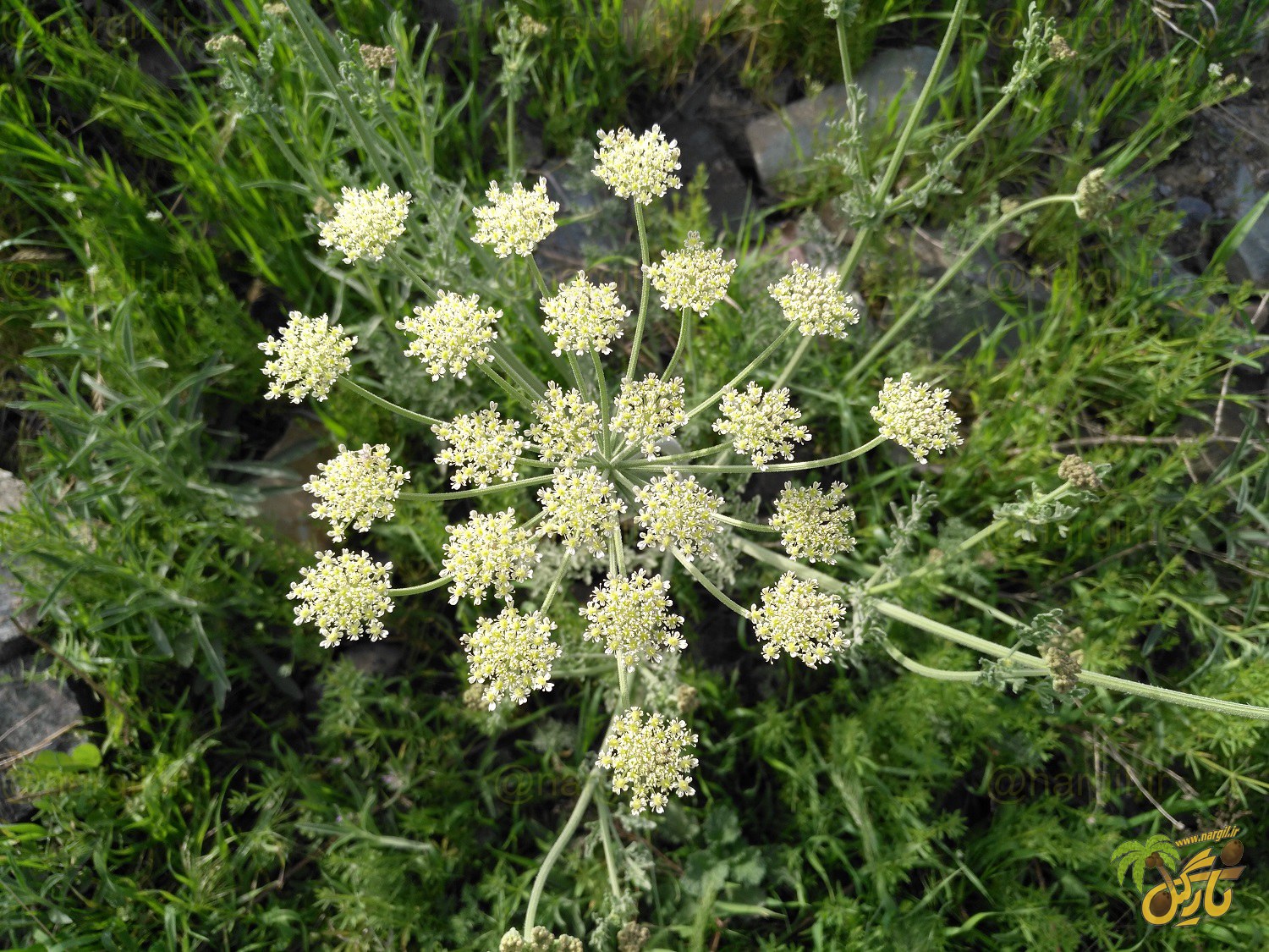 گل ها به رنگ سفید، مجتمع در چترهای نسبتا بزرگ با دمگل بلند و 30 تا 50 گلچه غیر هم قد، گسترده و ستاره مانند، گرده پوش، براکته های گریبان و گریبانک سرنیزه ای، نوک کند، کرکینه پوش، کاسه فاقد پهنک، دارای لوله تخم مرغی-مخروطی، پوشیده از کرک های سفید، گلبرگ های کنج دار، میوه در سطح پشتی فشرده در لبه و حاشیه عریض، متورم، صاف و پره های آن نازک می باشد.