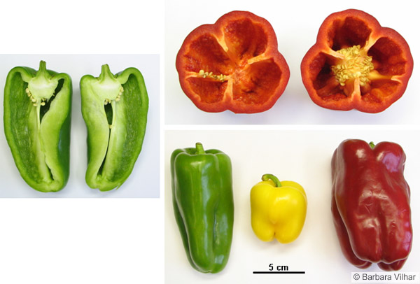 شکل میوه بسیار متغیر است آنها به صورت کشیده، نوک تیز، گرد و کروی مخروطی و یا استوانه ای مشاهده می گردند. رنگ میوه نارس سبز است ولی وقتی که رسید به رنگهای زرد، قرمز، یا قهوه ای ظاهر می شود.