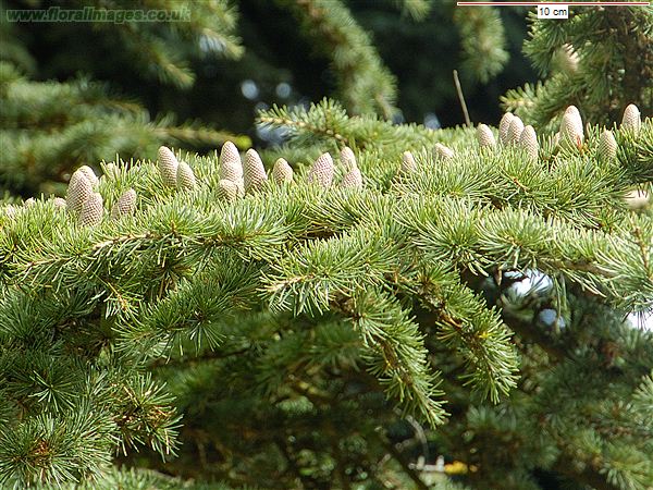 مخروط های رسیده در آخر پائیز دیده میشوند و 8 تا 12 سانتیمتر طول و 4 تا 6 سانتیمتر عرض دارند.