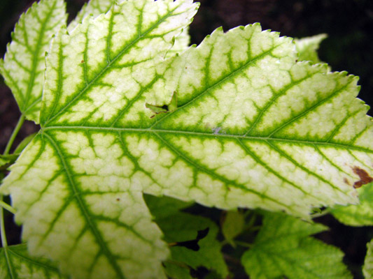 رگه های برگ، سبز باقی می مانند. معمولا کلروز برگ از نوک برگهای تازه و جدید گیاه