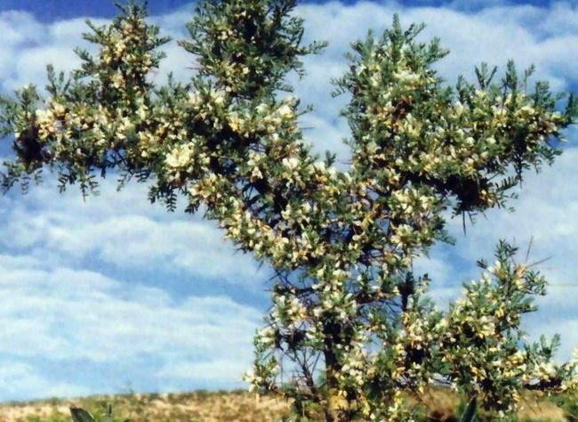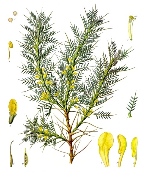 خاردار و برگ های آن کوچک، بیضوی و متقابل و گل ها پروانه آسا و غالباً سفید رنگ می باشد که در اوایل تیرماه ظاهر و