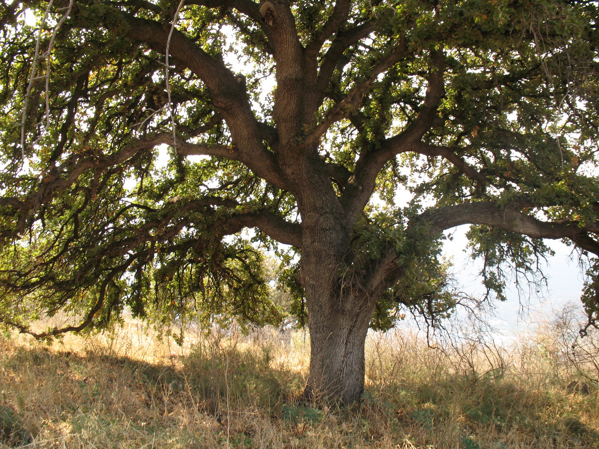 درخت و درختچه با برگ های کنگره ای دمبرگ دار متمایل به خاکستری دیده می شوند که