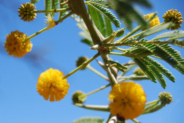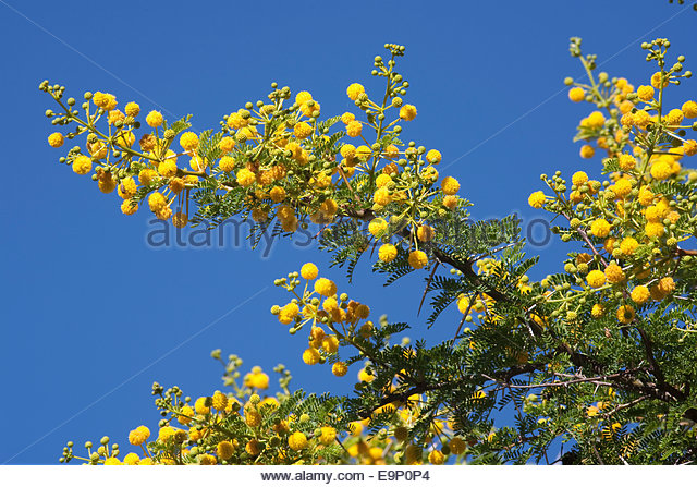 گل ها به رنگ زرد روشن و کروی شکل هستند. این گل ها دارای عطری شیرین بوده که نزدیک فصول بارانی ظاهر می شوند. این گیاهان پرگل بوده و تعداد زیادی گل در فصول مختلف تولید می کنند. حدود 0.1 درصد از گل ها تبدیل به غلاف میوه می شوند.