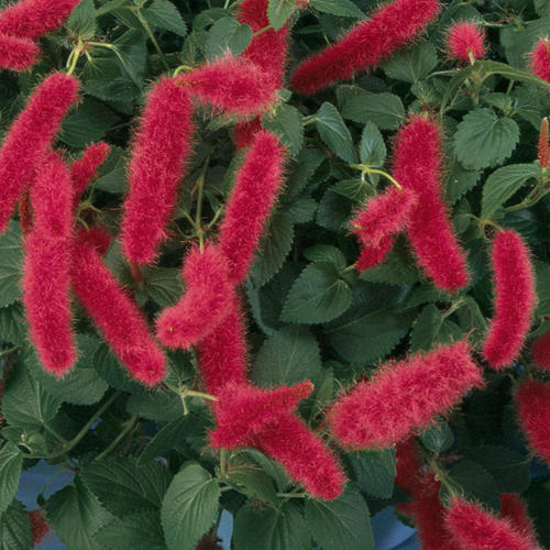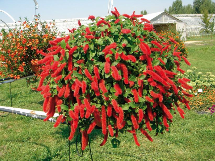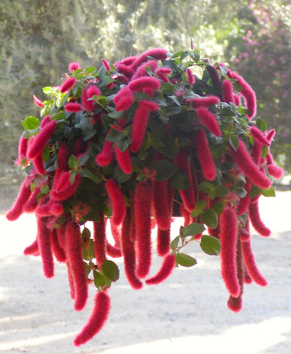 گل های این گیاه زیبا و به صورت شاتون هایی به رنگ قرمز و آویزان می باشند. هر گیاه می تواند تعداد زیادی گل تولید کند. در صورت مناسب بودن و گرم بودن دمای هوا، می تواند در تمام طول سال گلدهی داشته باشد. آن چه که ما در این گیاه، گل می نامیم در واقع سنبله ای است که از تعداد بیشمار گل های ریز به رنگ قرمز روشن تا صورتی تیره تشکیل شده است و حدود 15 تا 40 سانتیمتر نیز طول دارد. تعداد زیادی از این سنبله ها از ساقه های گیاه روییده و آویزان می شود و شکلی شبیه دم گربه پیدا می کند.