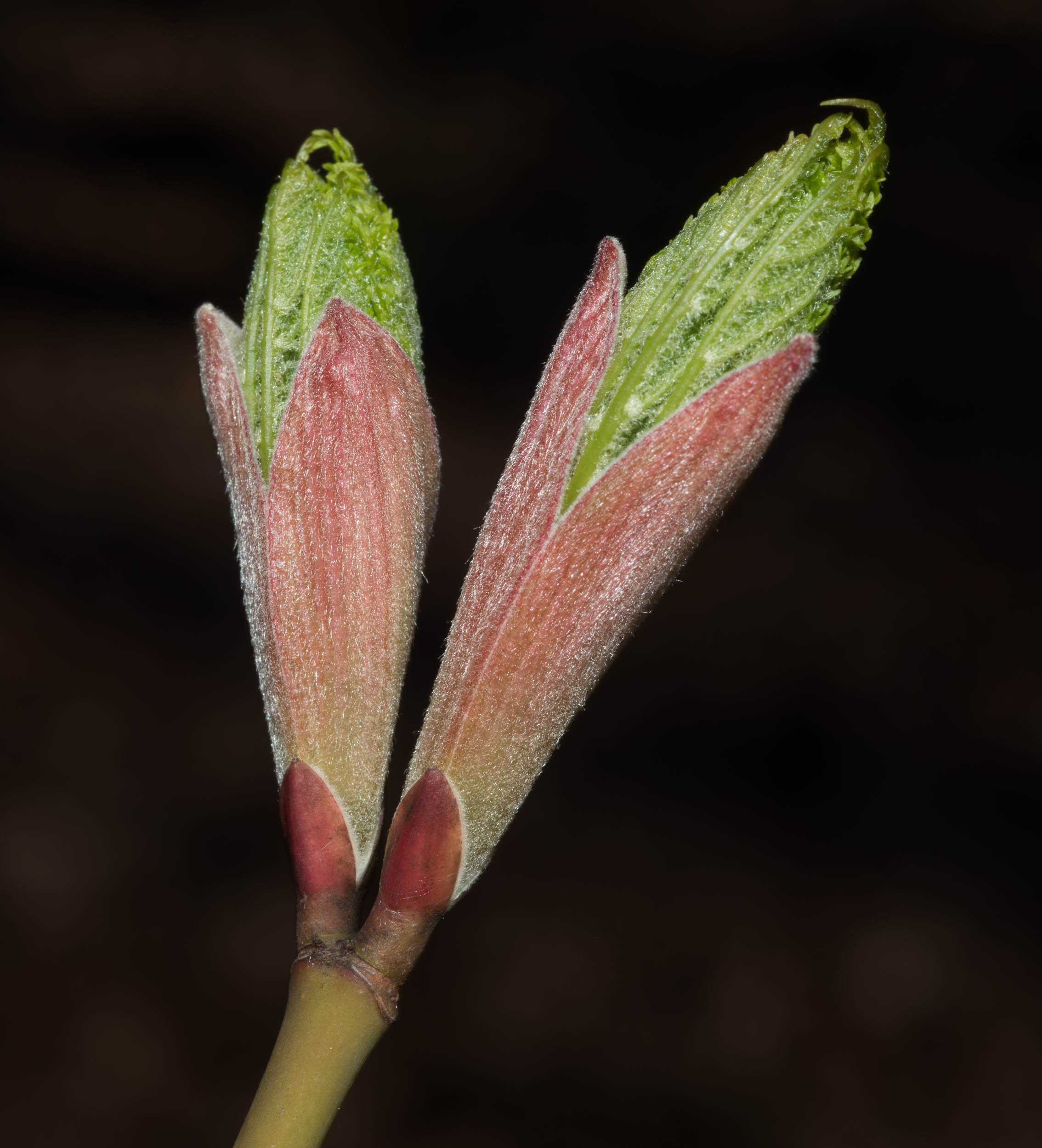 شاخههای جوان صاف، بدون کرک و معمولاً سبز درخشان هستند. جوانهها کوچک، تخممرغی تا بیضوی، به رنگ قهوهای مایل به قرمز و متناوب روی شاخه قرار میگیرند. فلسهای جوانه کمتعداد و نسبتاً پهناند و در انتهای شاخهها، جوانه انتهایی مشخص و اندکی برجسته دیده میشود.