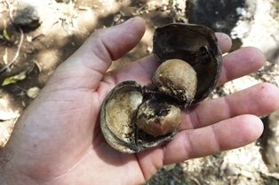 میوه ها گرد و نوک تیز، به قطر 5 تا 6 سانتیمتر هستند که وقتی از قسمت طولی شکافته می شوند دارای سه حجره و یک بذر می باشند.