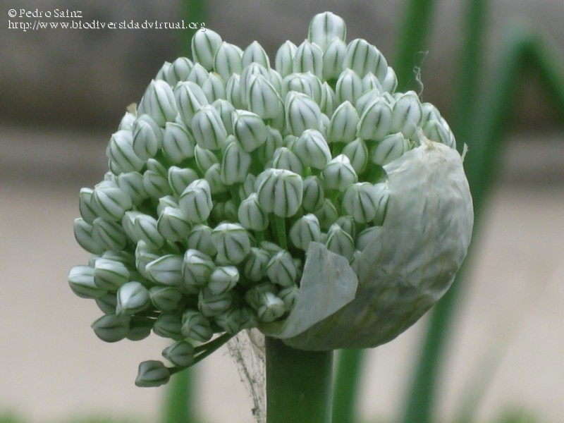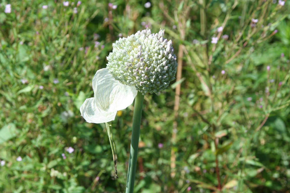 گلهای پیاز به رنگ سفید یا بنفش بهصورت چتر در انتهای ساقه دیده میشود.