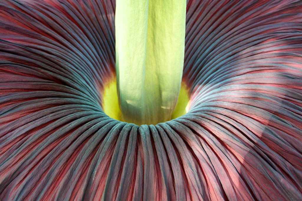 گل آذین گیاه تیتان می تواند به بیش از 3 متر (10 فوت) ارتفاع برسد. ظاهر این گل به نظر می رسد که از یک گلبرگ بزرگ تشکیل شده باشد. این گل دارای وجه خارجی سبز رنگ بوده که پس از شکفتن وجه داخلی آن به رنگ قرمز کبود ظاهر میشود.