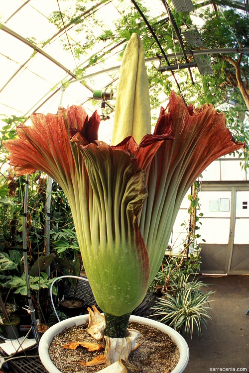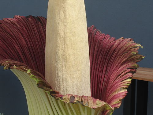 در گیاه تیتان ، اسپادیکس حدود 3 متر رشد می کند و بروی این گل آذین 3 متری هزاران گل قرار می گیرند . معمولاً 3 تا 4 هفته پس از رویش جوانه ، اسپات باز می شود ، اسپات تیتان در خارج سبز رنگ است ولی در قسمت داخلی قرمز تا بنفش تیره است . اسپات چند روز بیشتر باز نمی ماند وپس از آن محور اسپادیکس در مدت 3 تا 5 روز تخریب می گردد .