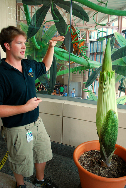 نام "Titan Arum" که این گیاه بیشتر به آن شهرت دارد اولین بار توسط David Attenborough مجری و گوینده مستند تلویزیونی بی بی سی که از این گل و گرده افشانی آن فیلم برداری میکرد ابداع شد.