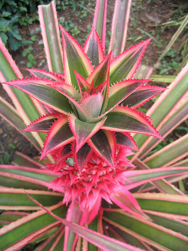 هنگام پیدایش گل، قسمت میانی گیاه، تماما به رنگ قرمز در می آید. این گیاه از سن سه یا چهار سالگی تولید میوه کوچکی مانند آناناس معمولی می نماید که بسیار سخت و خشبی است و قابل خوردن نمی باشد اگر میوه آناناس چیده نشود برگ های جدیدی روی آن ظاهر می شوند.
