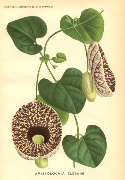 گیاه زینتی "آریستولوشیا الگانس" یکی از گیاهان رونده از خانواده آریستولوشیاسه می باشد که حدود 3 تا 4.5 متر نیز طول دارد. این گیاه دارای ساقه های بلند و باریک و چوبی است. برگ های آن به رنگ سبز روشن، قلبی شکل، به طول 7 تا 9 سانتیمتر و عرض 5 تا 10 سانتیمتر و انبوه می باشد. گل ها شیپوری، به رنگ زرد مایل به سبز با نقاط و طرح هایی به رنگ قهوه ای مایل به ارغوانی هستند. این گل ها حدود 7 تا 8 سانتیمتر طول داشته و به صورت منفرد در زاویه برگ ها تشکیل می شوند. دوره گلدهی این گیاهان، طولانی بوده و تمام طول تابستان می تواند رخ دهد. گل ها دارای عطر نامطبوعی هستند و گرده افشانی آنها توسط حشراتی صورت می گیرد که به سمت عطر گل ها جذب می شوند. هر گل تعدادی بذر تولید می کند. بذور بالدار بوده و به صورت کپسول خشک ناشکوفا می باشند که به صورت چتر از هم جدا می شوند. بالدار بودن بذرها این امکان را برای آنها فراهم می کند که به راحتی توسط وزش باد، پراکنده شوند.