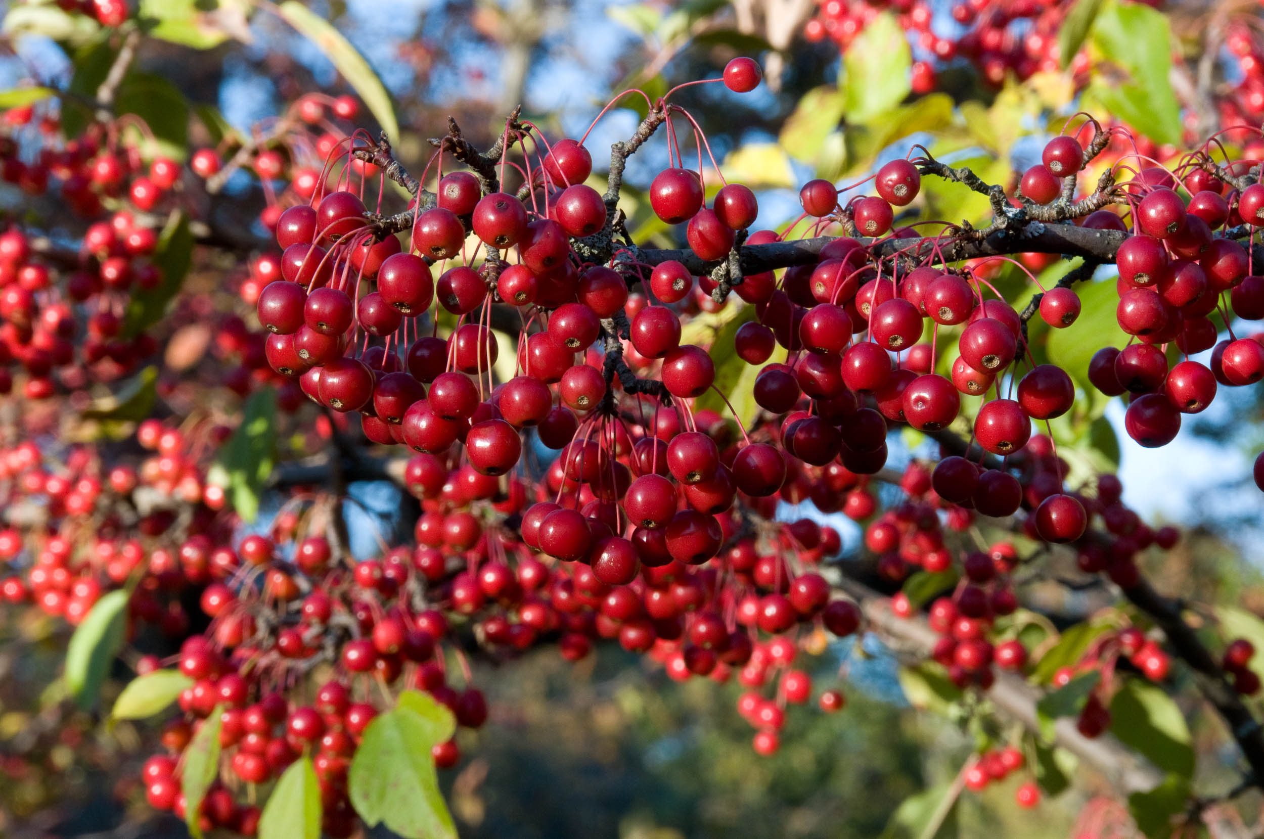 میوهها سته مانند، نسبتاً کوچک (حدود ۵ تا ۸ میلیمتر قطر) و ابتدا سبز هستند و در زمان رسیدگی به رنگ قرمز روشن تا قرمز تیره در میآیند. سطح میوه صاف و کمی براق است و به صورت خوشه ای در انتهای شاخه ها باقی میماند. پایداری میوه بر روی شاخه تا اواخر پاییز، جلوه بصری خاصی ایجاد میکند. سیستم ریشهای فیبری و نسبتاً گسترده است که به استقرار خوب گیاه در خاک کمک میکند.