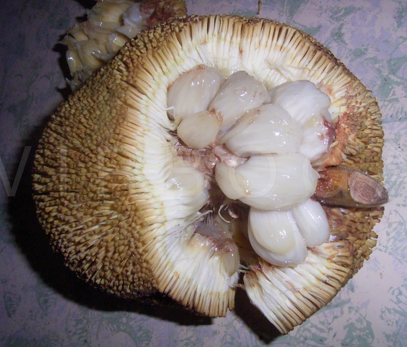 میوه ها ز نظر ظاهری بینابین جک فروت و میوه نان هستند. این میوه ها گرد تا کروی شکل، به طول 15 تا 20 سانتیمتر و پهنای 13 سانتیمتر می باشند. هر میوه می تواند حدود یک کیلوگرم نیز وزن داشته باشد. پوست میوه ها با خارهای نرم و پهن پوشیده شده است. میوه های بالغ بسیار سخت و ترد و شکننده می باشند.