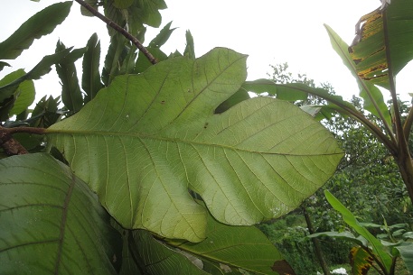 برگ ها به طول 16 تا 50 سانتیمتر و پهنای 11 تا 28 سانتیمتر دیده می شوند.برگ های این درخت مشابه برگ های درخت میوه نان است، با این تفاوت که لوب ها در برگ های این گیاه کمی کوچکتر می باشند. در برخی از گیاهان این گونه، در سال های اولیه بلوغ ممکن است برگ ها فاقد لوب نیز باشند.