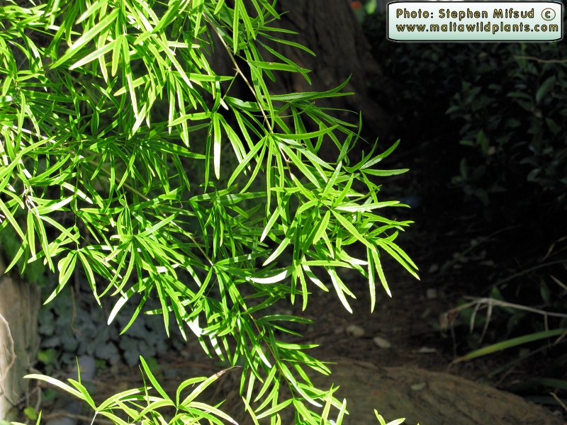 برگها تا 80 میلی متر طول دارند و به شکل داس با رنگ سبز براق و تیره با رگه های برجسته میباشد.
