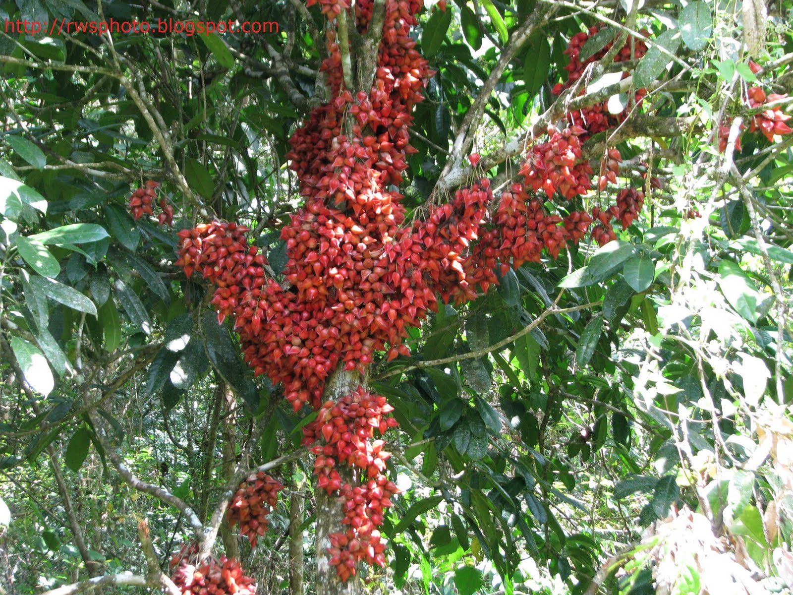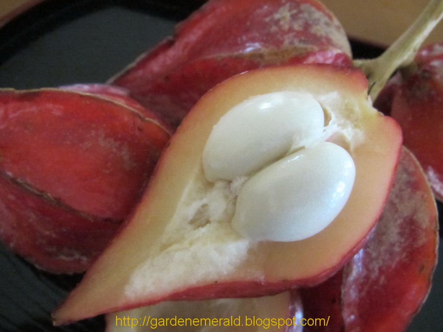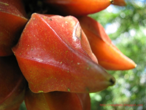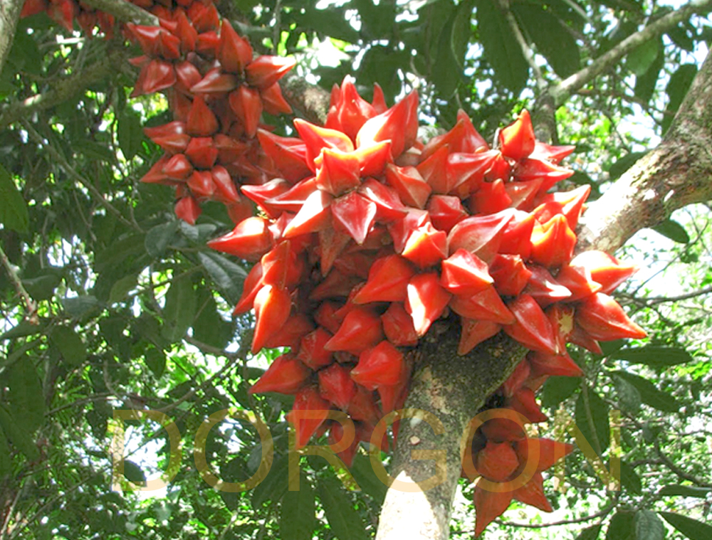 میوه ها واژتخم مرغی، ستاره ای شکل و دارای شیارهای طولی می باشند. هر میوه حاوی یک تا سه بذر است. این میوه ها به ابعاد 30-52 × 10-26 × 10-26 دیده می شوند. میوه ها به رنگ قرمز تا ارغوانی تا صورتی تا قرمز – قهوه ای هستند. پریکارپ میوه حدود 2 میلیمتر ضخامت دارد. میوه های این گیاهان عمدتاً بر روی تنه درخت یا شاخه های اصلی آن تشکیل می شوند.