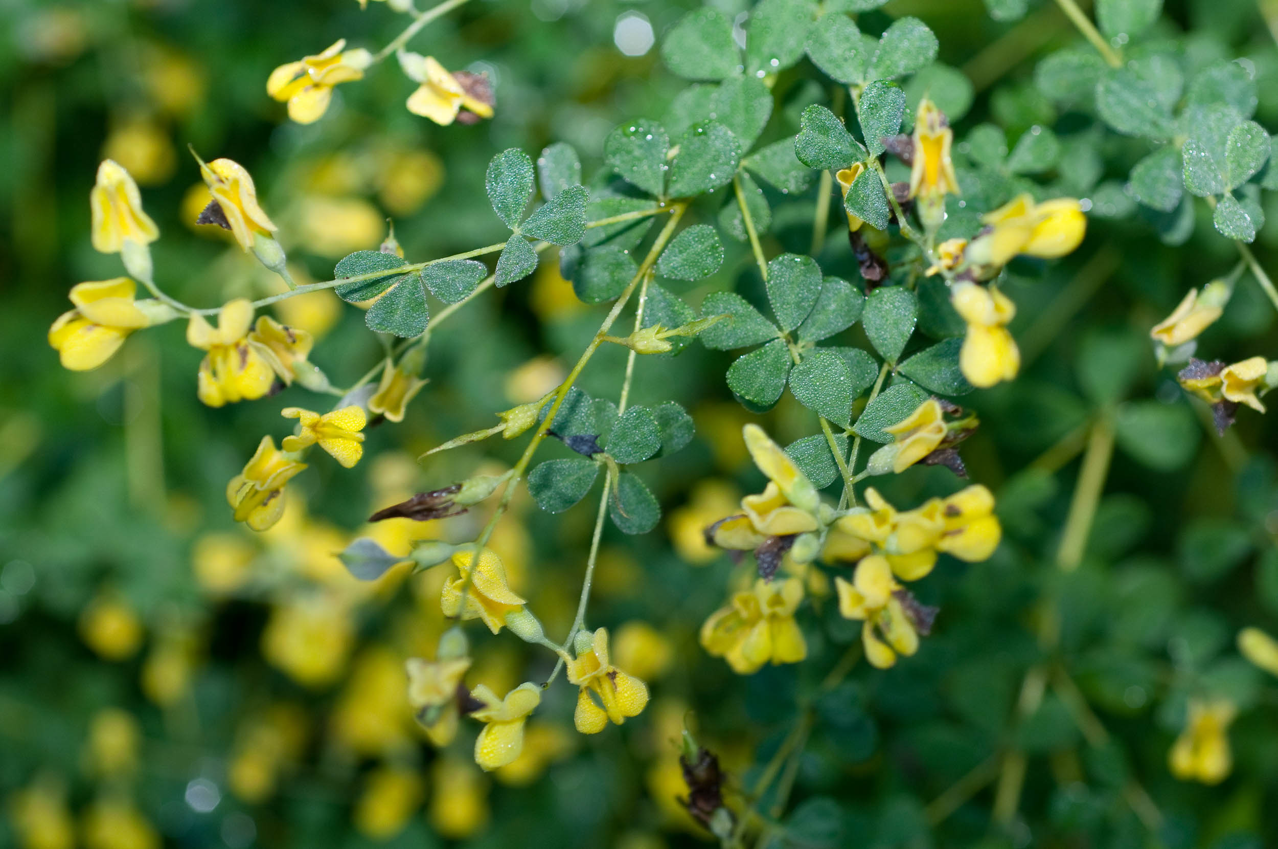گلها پروانهآسا و مشخصه تیره باقلاییان هستند و بهصورت خوشههای انتهایی یا جانبی روی ساقه ظاهر میشوند. رنگ گلها زرد روشن تا زرد طلایی است و هر گل حدود ۱ تا ۲ سانتیمتر طول دارد. گلها شامل پرچمدان قایقیشکل، بالها و پرچم فوقانی (پرچمبرگ) مشخص هستند و حالت عمودی تا کمی آویخته دارند. گلآذینها نسبتاً باریک بوده و در زمان شکوفایی، تضاد زیبایی بین گلهای زرد و برگهای مایل به آبی ایجاد میکنند.