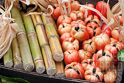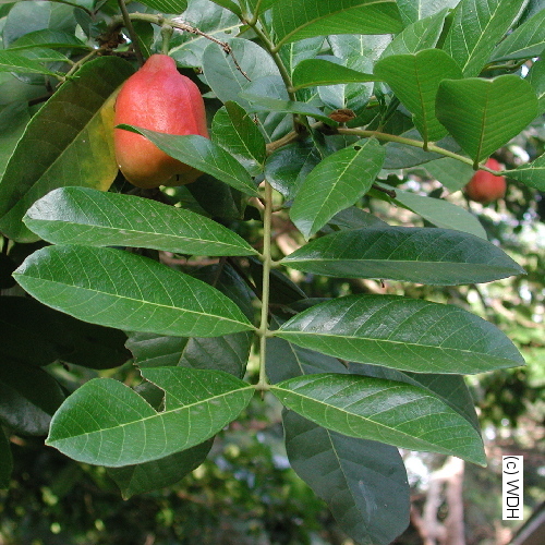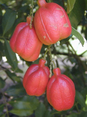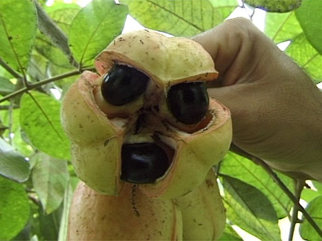 میوه ها شبیه گلابی بوده و هنگامی که می رسد از سبز به قرمز روشن تا زرد-نارنجی تغییر رنگ می دهد. لحظه ای که کاملا می رسد می شکافد و بذر های بزرگ ، سیاه ، براق را نمایان می سازد. که هر قسمت با آریل سفید تا زرد ، کرمی ، نرم و اسفنجی احاطه شده است. وزن میوه 100 تا 200 گرم بوده است.