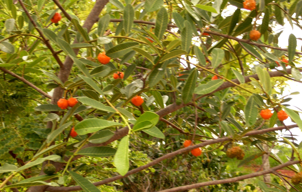 این درختان، میوه های کوچکی تولید می کنند که در صورت رسیده شدن به رنگ نارنجی و با کرک هایی خاکستری مشاهده می شوند. این میوه ها آبدار، شیرین و چسبناک بوده به طوری که همانند صمغ می توانند جویده شوند. میوه ها حدود چهار سانتیمتر نیز قطر دارند.