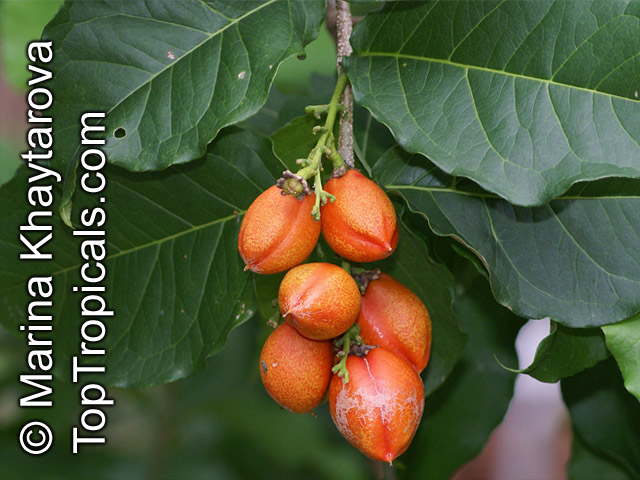 شکل میوه ها بیضوی شکل و همانند شکل زردآلو (Prunus armeniaca) است. به همین دلیل به آن Bunchoisia armeniaca یا Malpighia armeniaca گفته می شود. این میوه ها شیرین بوده و به صورت خام یا پخته مصرف می شوند. میوه های رسیده به رنگ زرد یا قرمز بوده که حدود 3 تا 4 سانتیمتر طول داشته و دارای گوشتی کِرِم رنگ می باشند.