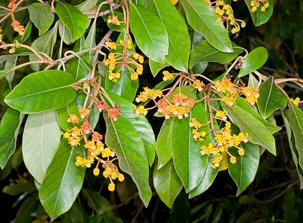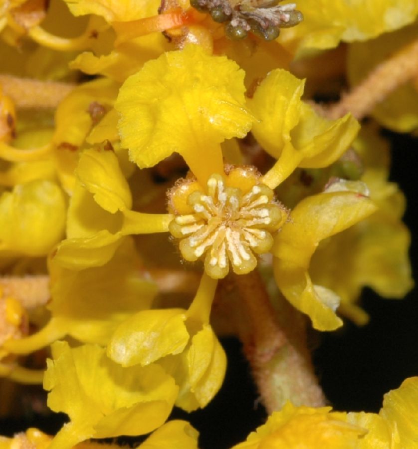 گل ها دارای کرک های قرمز رنگ کم یا زیاد بوده و به صورت خوشه هایی به طول 10 تا 20 سانتیمتر و عرض 1.25 تا 2 سانتیمتر دیده می شوند. این گل ها دارای 5 گلبرگ هستند که در ابتدا به رنگ زرد و در نهایت به رنگ نارنجی – قرمز کمرنگ دیده می شوند.