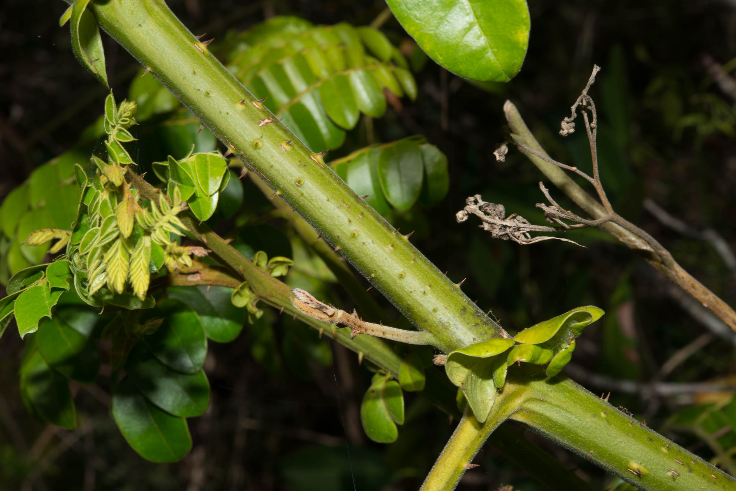 ساقه‌ها استوانه‌ای، چوبی و نسبتاً انعطاف‌پذیرند و قابلیت پیچیدن روی درختان مجاور را دارند. خارها کوتاه، تیز، زرد تا قهوه‌ای‌رنگ و در فواصل نسبتاً منظم روی ساقه و رگبرگ‌های اصلی برگ پراکنده‌اند. وجود خارها از شاخص‌ترین ویژگی‌های ظاهری این گونه است.