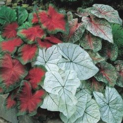 جنس caladium شامل 7 گونه مختلف میباشد ، برگهای این گونه به شکل قلب است ودر الگوهای مختلف به رنگهای سفید، صورتی و قرمز دیده میشود.