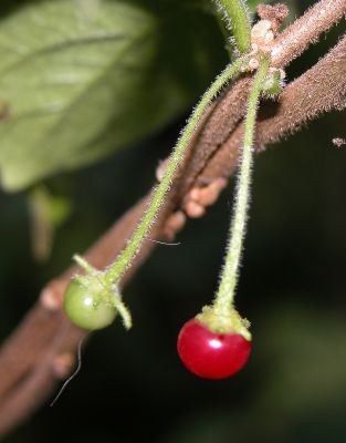 میوه ها در اندازه های بسیار کوچک به قطر 5 تا 6 میلیمتر و سته ای بوده که در صورت رسیدن کامل به رنگ قرمز دیده می شوند. به این میوه ها، پنج کالیکس دندانه دار نیز متصل است. هر میوه دارای تعدادی بذر می باشد. میوه های کوچکتر بیش از دو بذر ندارند اما میوه های بزرگتر هر کدام دارای پنج تا شش عدد بذر می باشند.
