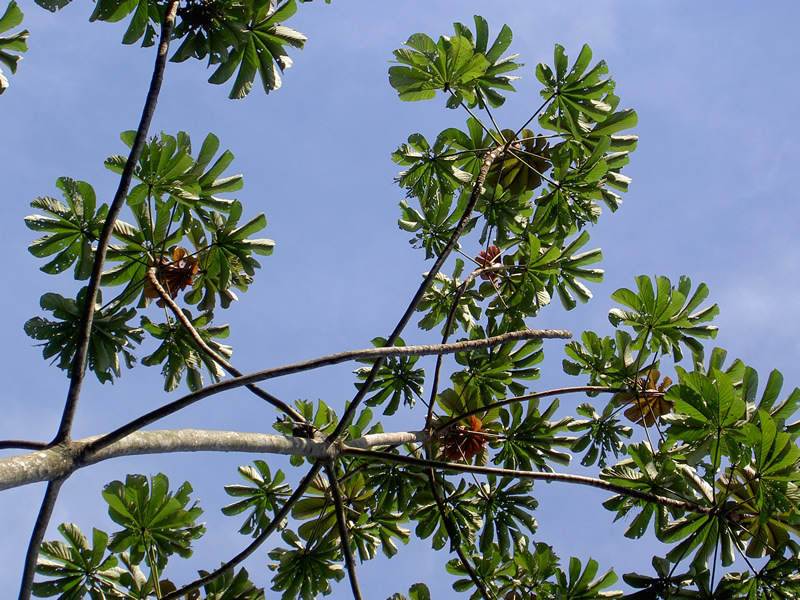 برگ ها دارای دمگی به طول 0.4 تا 1.2 سانتیمتر و با حاشیه ای لوبدار می باشند. طول این برگ ها به حدود 20 تا 90 سانتیمتر نیز خواهد رسید. به دلیل شباهت زیاد برگ های این گونه از پاپایا به برگ های درخت بلوط، به آن پاپایای برگ بلوطی گفته می شود.