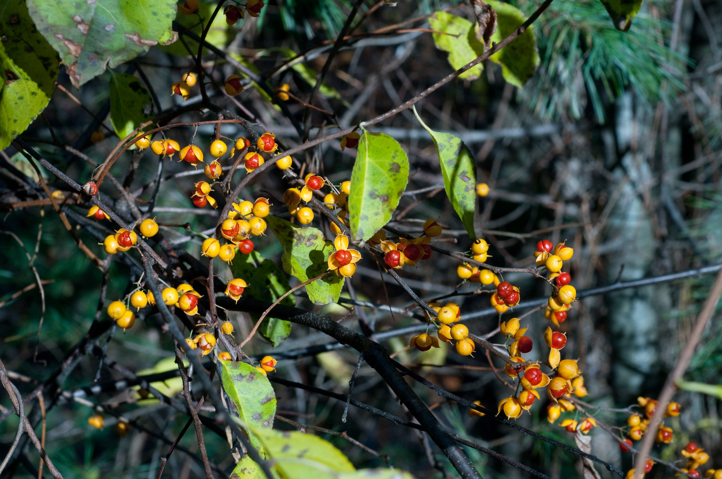 میوهها کپسولهای کروی کوچک به قطر حدود ۶ تا ۸ میلیمتر هستند که در آغاز سبز بوده و در رسیدگی به رنگ زرد درخشان درمیآیند. با رسیدن، پوسته زرد میوه شکافته شده و سه لپه آن باز میشود و لپههای گوشتی نارنجیرنگ حاوی دانههای براق قهوهای تا قهوهای تیره نمایان میگردد. میوهها در پاییز بسیار جلبتوجه میکنند و تا زمستان روی شاخهها باقی میمانند.