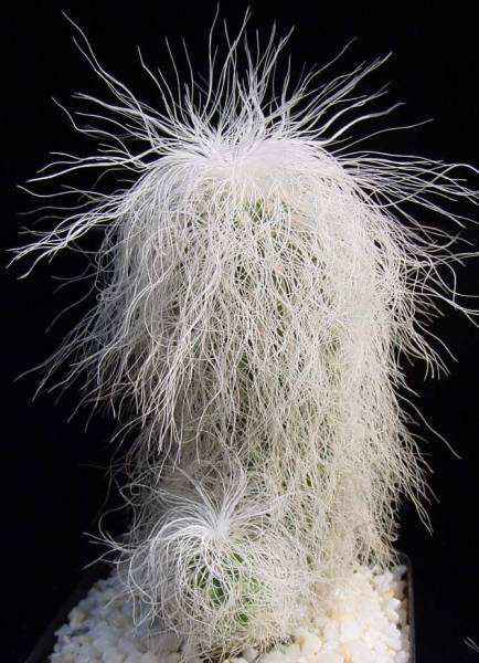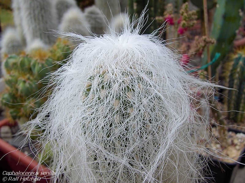 قابل توجه ترین ویژگی آن موهای بلند و پرپشت سفید آن است که برای محافظت از آفتاب در خدمت گیاه است. پوشش موی این گیاه باعث میشود تقریبا مثل برف سفید به نظر برسد و همین امر موجب محبوبیت بیشتر آن شده و به کاکتوس پیرمرد مشهور شده است. در مرحله جوانی موهای ای کاکتوس ، به رنگ سفید مایل به نقره ای است.
