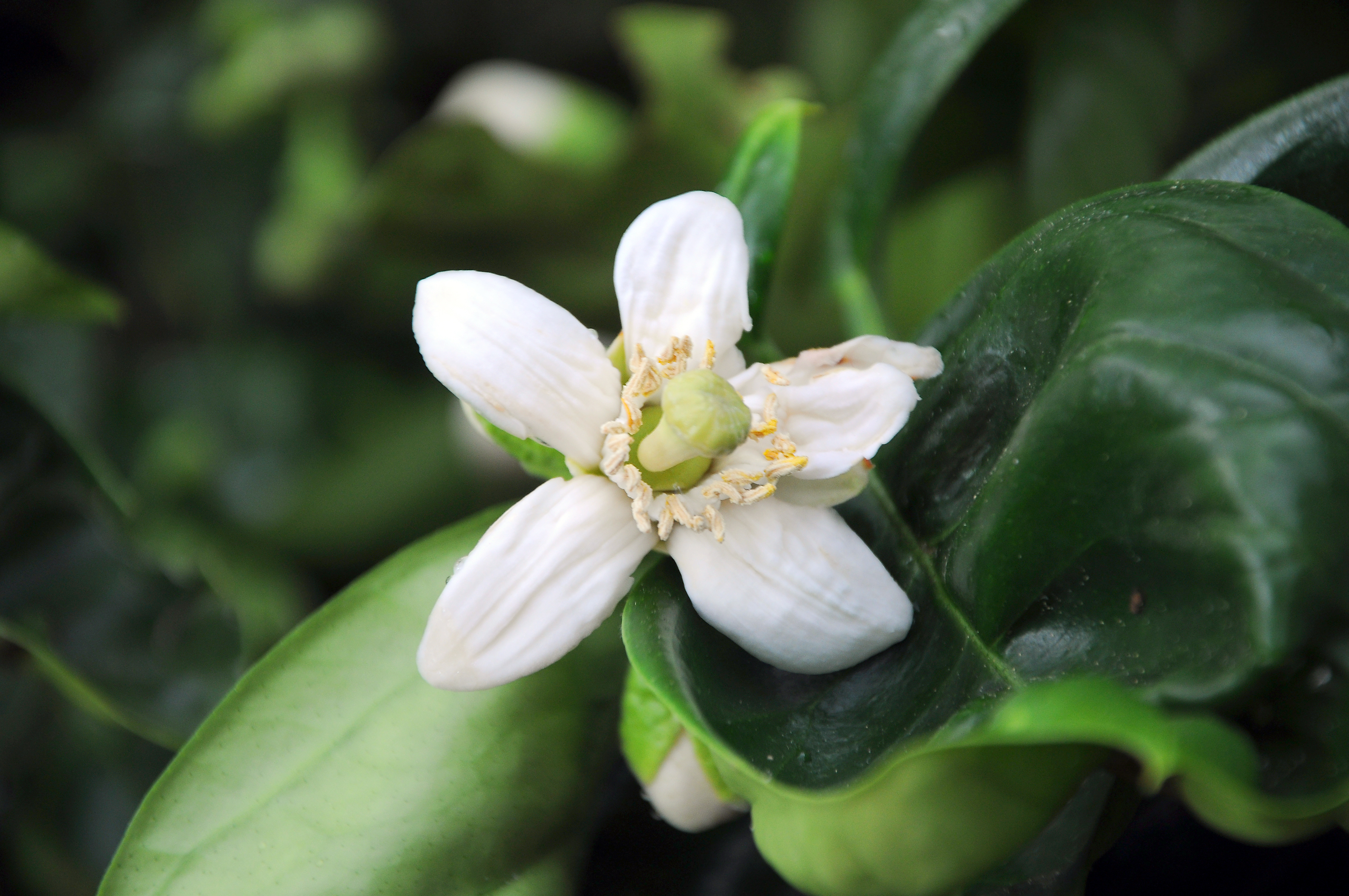 برگ ها بیضی شکل، به طول 10.5 تا 20 سانتیمتر، دارای زایده ای در قسمت دمبرگ که برگ مانند است، می باشد.