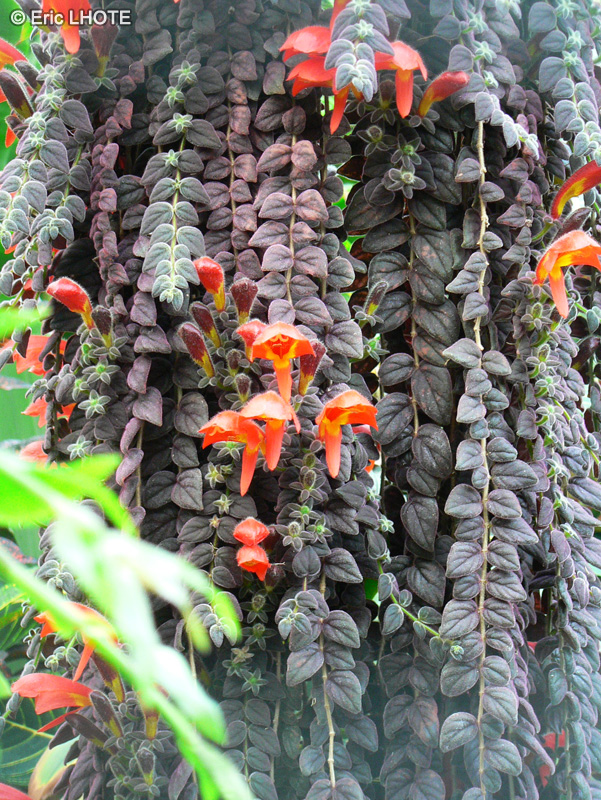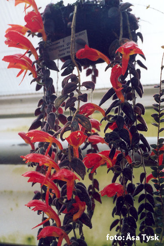 این گیاه دارای شاخه های بلند و افتاده و ظریف است ، برگ های نسبتا کوچک و پرز دار و متقابل است. برگ به رنگ بنفش و سبز هستند. گل ها به رنگ قرمز و نارنجی و ظاهری شبیه به ماهی قرمز دارند.