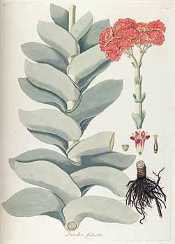 کراسولا فالکاتا دارای متابولیسم CAM است که به آن امکان می‌دهد در شب تبادل گازی انجام داده و در روز از اتلاف آب جلوگیری کند. این گونه در قرن هجدهم توسط گیاه‌شناسان اروپایی در جریان کاوش‌های فلور کیپ جمع‌آوری و توصیف شد. از قرن نوزدهم به عنوان یک سوکولنت زینتی وارد مجموعه‌های گیاه‌شناسی اروپا شد و امروزه نمونه‌های آن در هرباریوم‌های معتبر جهان نگهداری می‌شود.