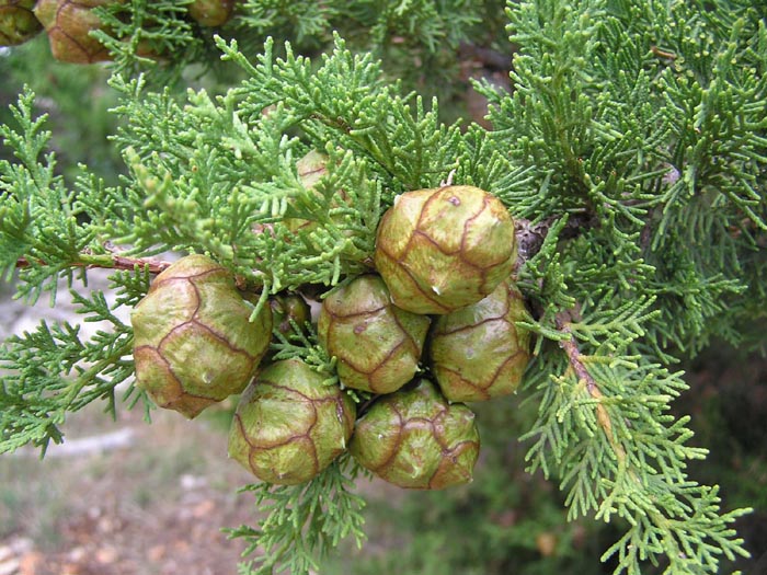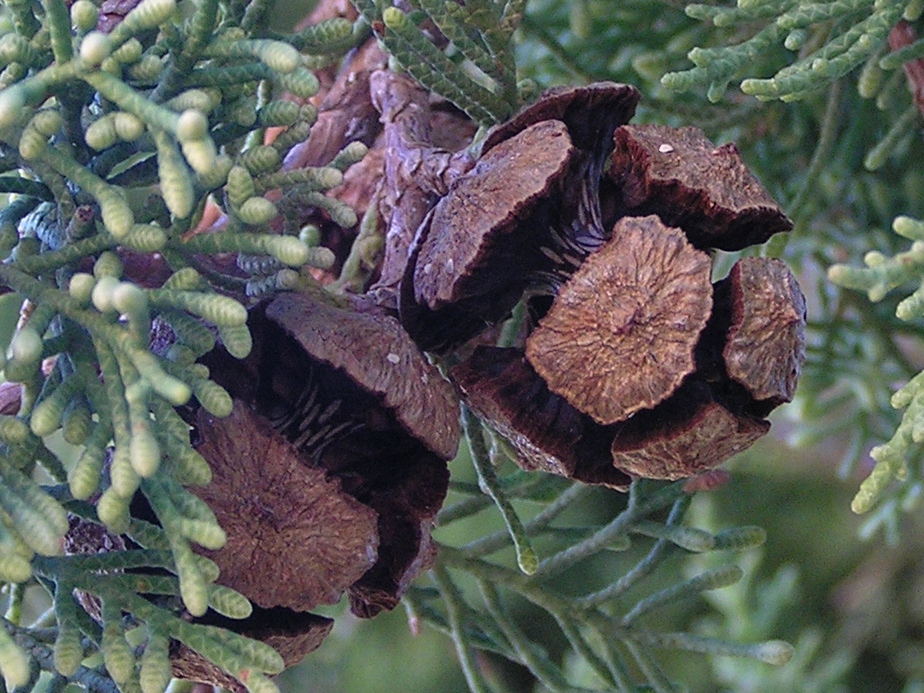 مخروط نر به شمل تخم مرغي كشيده ، نوك آن گرد و يا گوه اي به رنگ سبز روشن تا زرد و در انتهاي شاخه هاي كوتاه قرار دارند . مخروط ماده كروي و يا تخم مرغي ، در قاعده و محل اتصال به پايك كمي فرورفته و سطح آن صاف تا كمي چروكيده و ناهموار و رنگ آن سبز روشن تا تيره و براق است