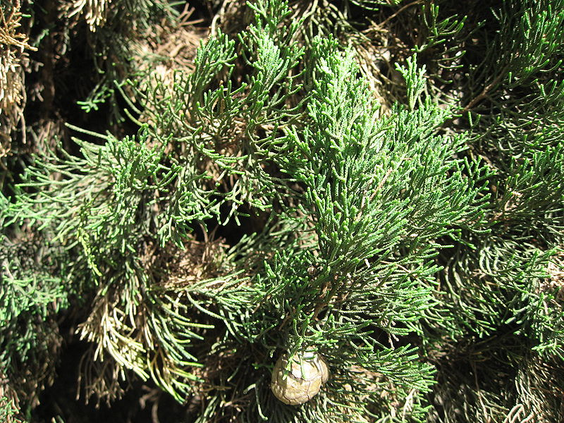 شاخ و برگ این درخت نسبتاً متراکم و به رنگ سبز تیره است. برگ ها حدود 2 تا 5 میلی متر طول دارند. مخروط در ابتدا تخم مرغی شکل و یا مستطیل، به طول 25 تا 40 میلی متر، با 10 تا 14 فلس سبز و سپس قهوه ای رنگ میباشد که 20 تا 24 ماه بعد از گرده افشانی به بلوغ میرسد. مخروط نر 3 تا 5 میلیمتر طول و گرده افشانی آن در اواخر زمستان است.