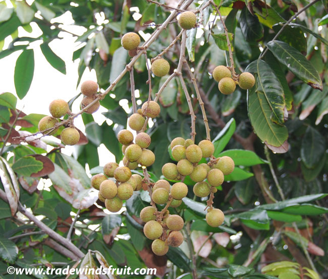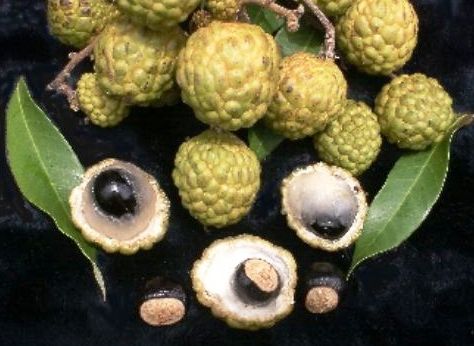میوه ها گرد و کروی، به عرض 2.5 سانتیمتر، دارای اندام های زگیل مانند روی پوست میوه می باشند. این میوه ها دارای پوستی به رنگ قهوه ای روشن و پالپی به رنگ سفید و نیمه شفاف بوده که یک بذر گرد و کروی را احاطه می کند. این بذرها بزرگ و به رنگ سیاه هستند.