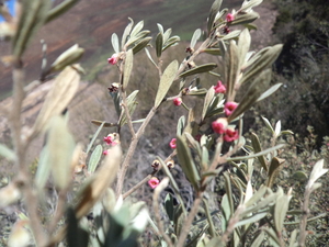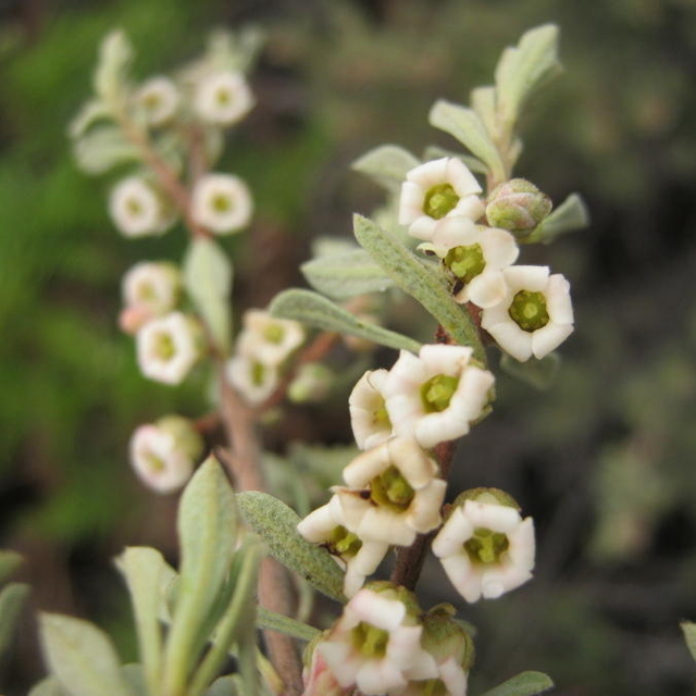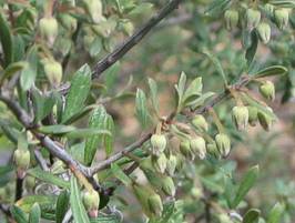 برگ ها باریک، واژتخم مرغی، و کرکدار بوده که به دلیل وجود این کرک های ریز، ظاهری خاکستری به درخت می دهد. این برگ ها در انتهای شاخه ها و به صورت مجمتع ظاهر می شوند. و در ابعاد 35 میلیمتر در 2-5 میلیمتر، نیمه دمبرگ دار، کشیده، کرکدار و خزاندار می باشند.