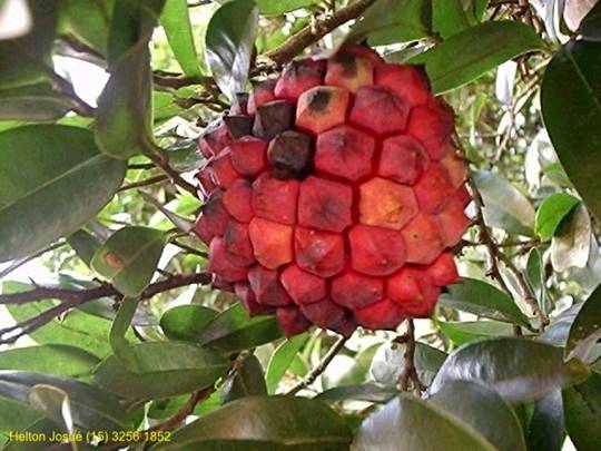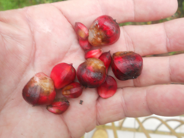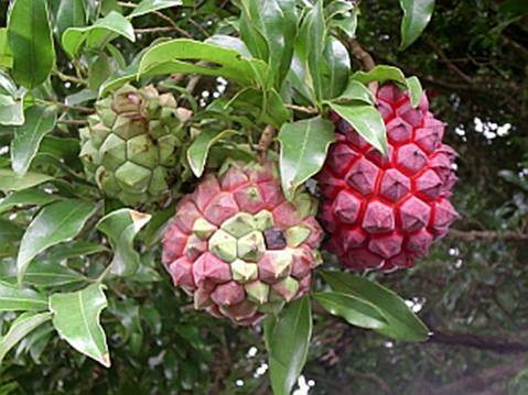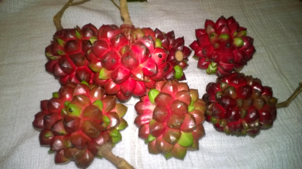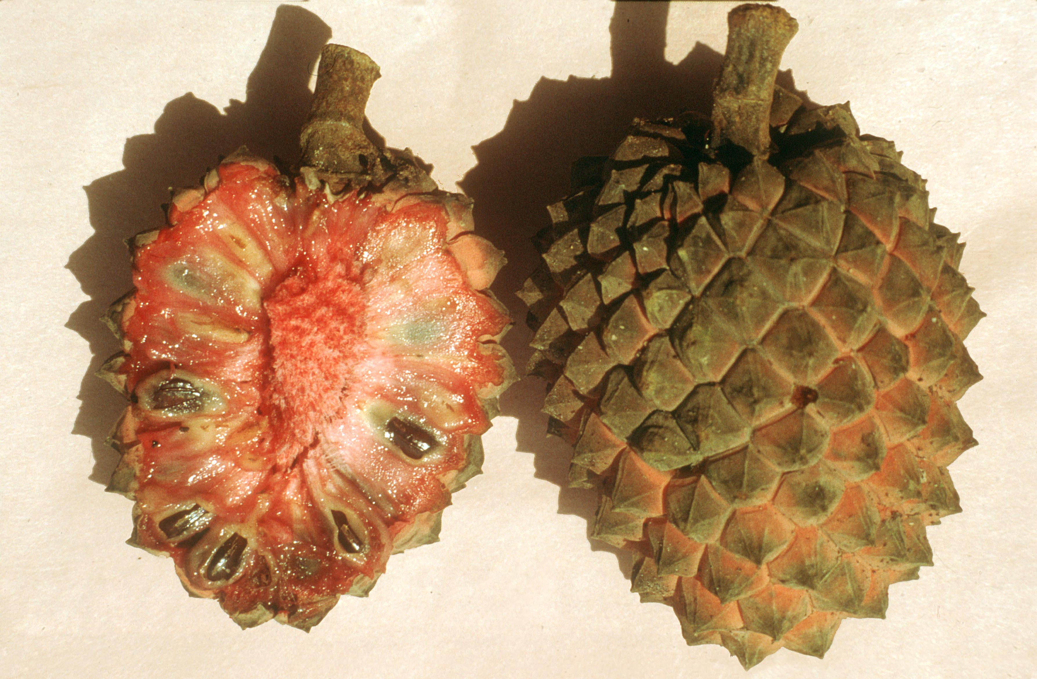 میوه ها دارای چند لوب، به رنگ قرمز و دارای آریل تقریباً سفید رنگی هستند که بذرها را در برگرفته اند. این میوه ها حدود 5 تا 8 سال پس از کشت تشکیل می شوند. اگر چه گوشت میوه ها کم است ولی دارای مزه ای مناسب همانند مزه ی سیب شیرین می باشند. این میوه ها 8 تا بیش از 15 سانتیمتر طول دارند.