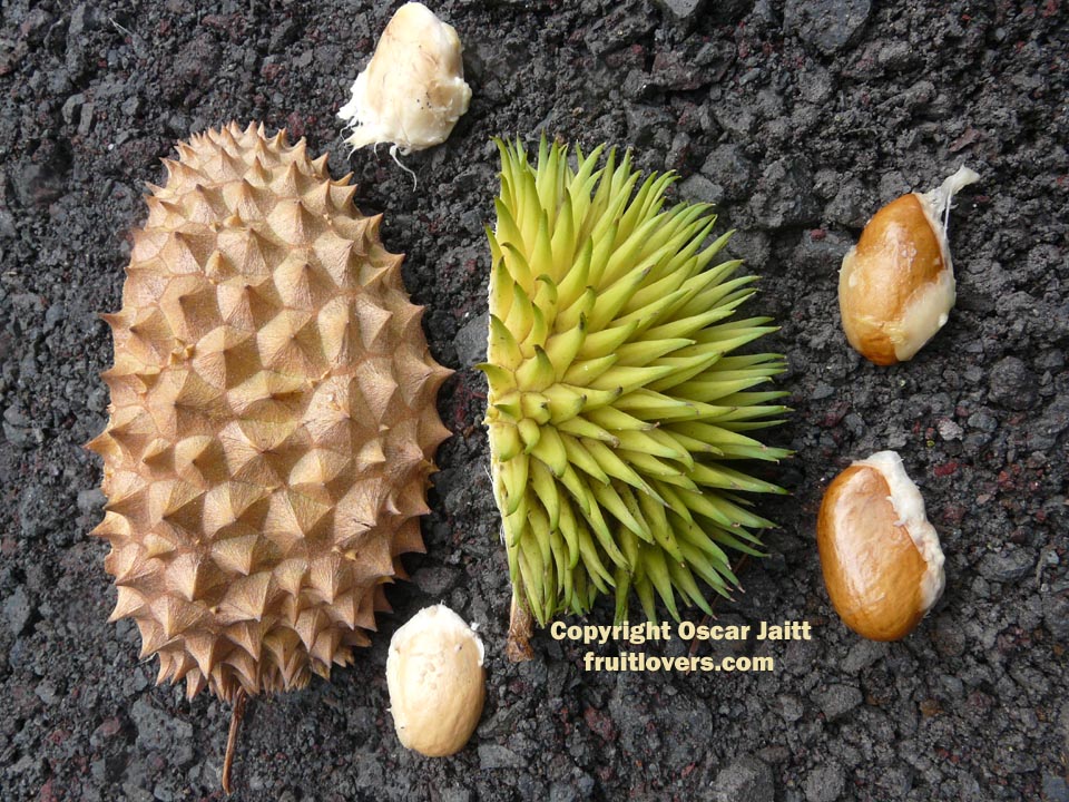 این گونه نسبت به دیگر گونه های durian مقاوم تر می باشد. میوه ها خاردار بوده و از گونه durio zibenthesis متقارن تر است. میوه ها پس از ماندن روی درخت شکافته می شوند و بطور طبیعی نمی ریزند. در کشت و کار آن هنگامیکه شکاف برداشته می شود برداشت می شود. گوشت آن می تواند هر درجه ای از رنگ زرد ، نانجی یا قرمز باشد.